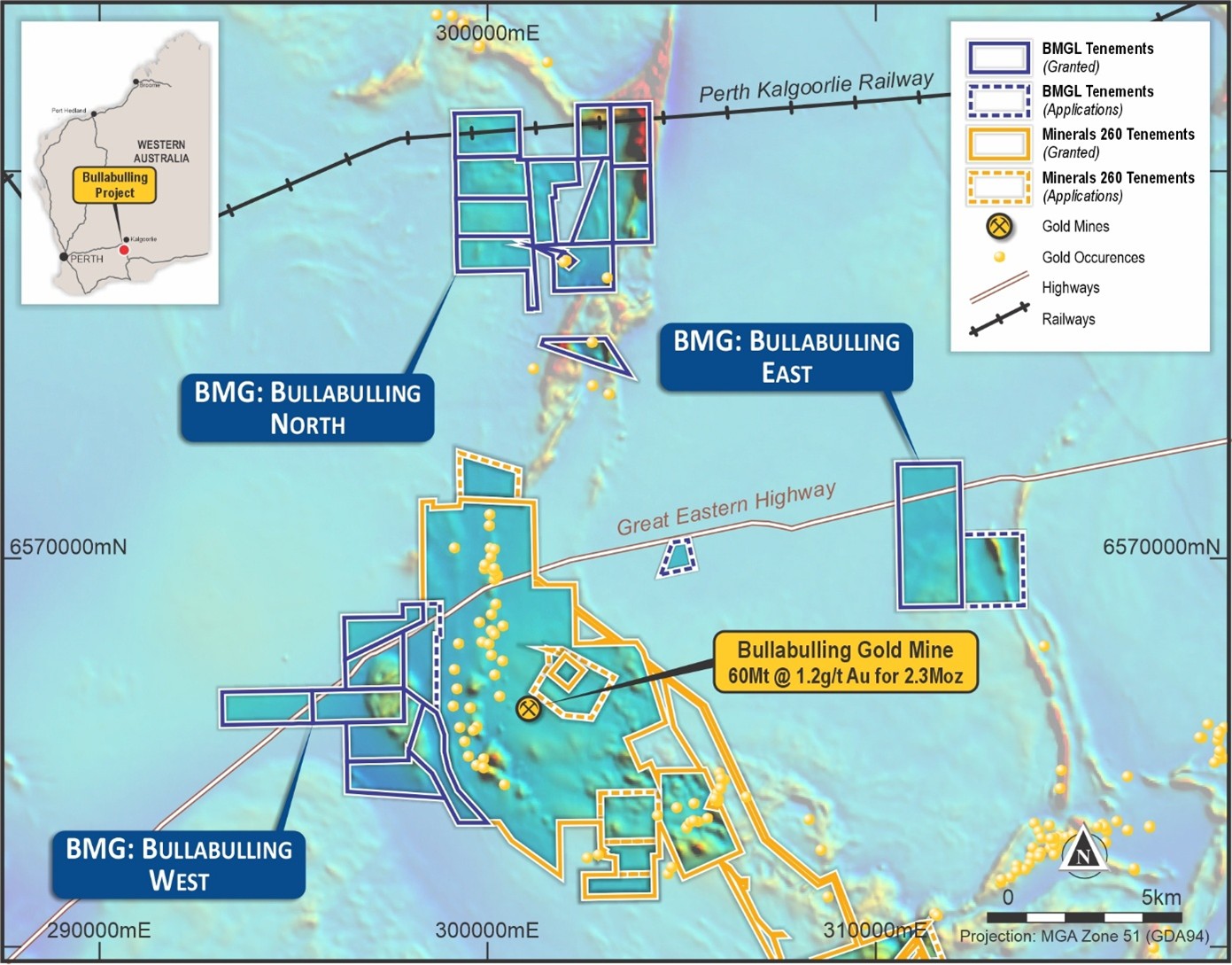 The Bullabulling Gold Mine is located approximately 1.5km from BMG’s Bullabulling Project with several BMG tenements immediately adjacent to the western portion of the Bullabulling Gold Mine’s tenure.