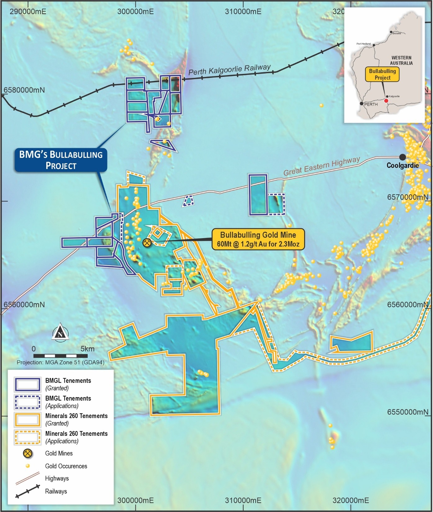 The Bullabulling Gold Mine is located approximately 1.5km from BMG’s Bullabulling Project with several BMG tenements immediately adjacent to the western portion of the Bullabulling Gold Mine’s tenure.